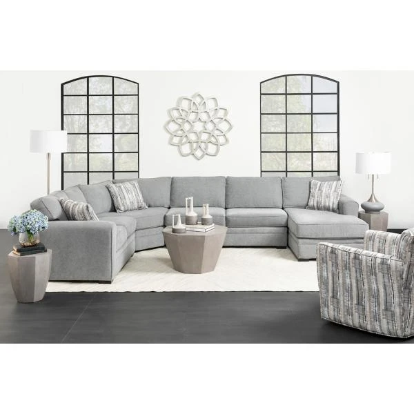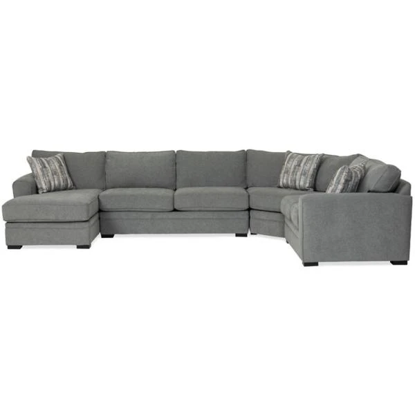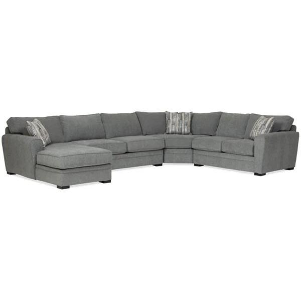 The Artemis Granite 4 piece sectional features crisply tailored lines outlined with welting. A medium gray, soft to the touch body fabric is accented by a pattern of ivory, grays, and black for 3 toss pillows.