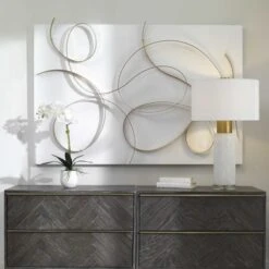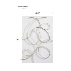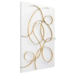 A feminine take on abstract contemporary styling, featuring a solid iron construction. The matte white base is accented by a free-flowing hand forged metal design in a classic brushed gold finish. May be hung horizontal or vertical.