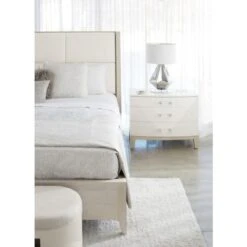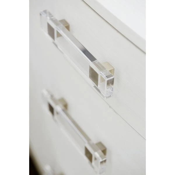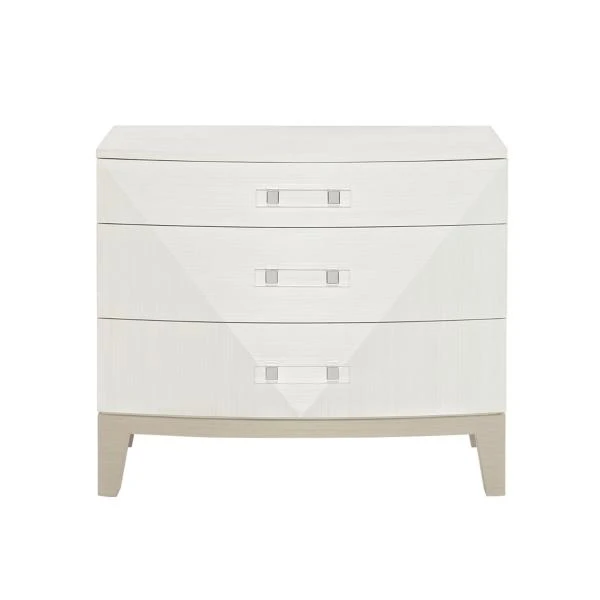 The Axiom Collection by Bernhardt combines contemporary finishes and clean lines creating a bedroom that is warm and inviting. The Axiom Three Drawer Nightstand is crafted of poplar solids and engineered faux anigre veneers in linear white finish with linear gray on base and legs. The three drawers feature a soft curved front with a unique inverted pyramid pattern, English dovetail joinery and clear acrylic bar handles. The nightstand includes adjustable glides and anti-tip kit.