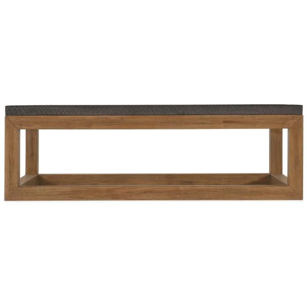 With a simple and straightforward silhouette that evokes the weight, heft and heritage of beam construction, the Big Sky Cocktail Table boldly contrasts a Vintage Natural wood base with a crosshatch texture on the top in the charcoal Furrowed Bark finish. The natural beauty and near mystical experience of the American wilderness inspires a spirited collection from Hooker Furniture, a celebration of dramatic vistas and the freedom to roam, a land of rough-hewn timber and towering snow-capped peaks, boundless plains, and cool, clear mountain lakes