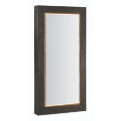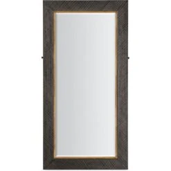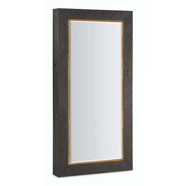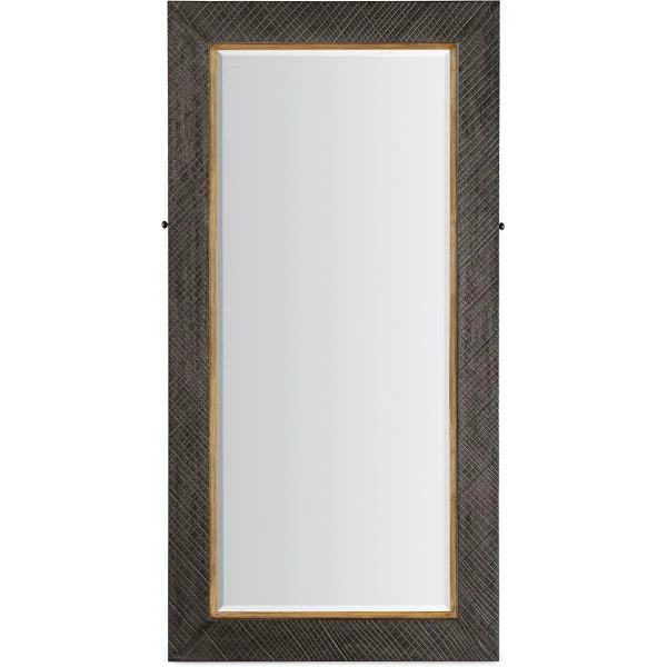 The Big Sky Floor Mirror with Jewelry Storage by Hooker Furniture is crafted of pecky hickory veneers with a solid wood and resin frame. A beautiful furrowed bark crosshatch textured design with Vintage Natural finished trim. Features include storage features beveled mirror glass, two side drawers with English dovetail joinery, antique bronze finished pulls, three rows of fifteen necklace hooks and two rows of ring slots. Mounts to the wall.