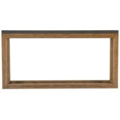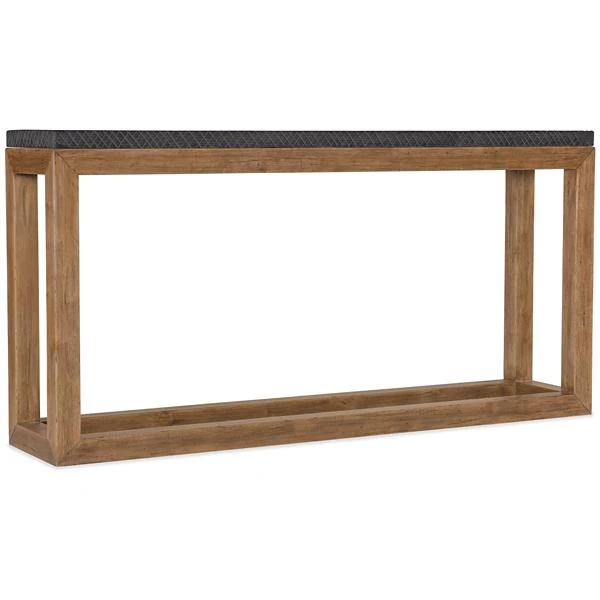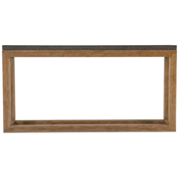 With a simple and straightforward square-shaped silhouette that evokes the weight, heft and heritage of beam construction, the Big Sky Sofa Table boldly contrasts a Vintage Natural wood base with a crosshatch texture on the top in the charcoal Furrowed Bark finish. The natural beauty and near mystical experience of the American wilderness inspires a spirited collection from Hooker Furniture, a celebration of dramatic vistas and the freedom to roam, a land of rough-hewn timber and towering snow-capped peaks, boundless plains, and cool, clear mountain lakes. It is constructed of hickory veneers and resin. The narrow, 14 inch depth makes it versatile for even tight spaces.