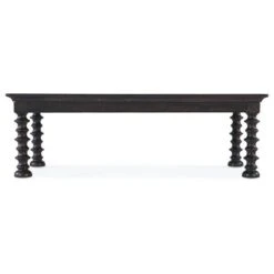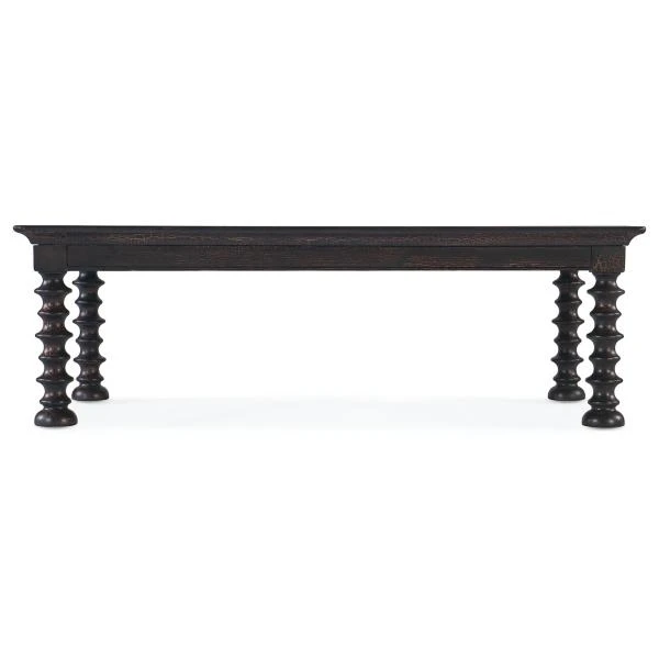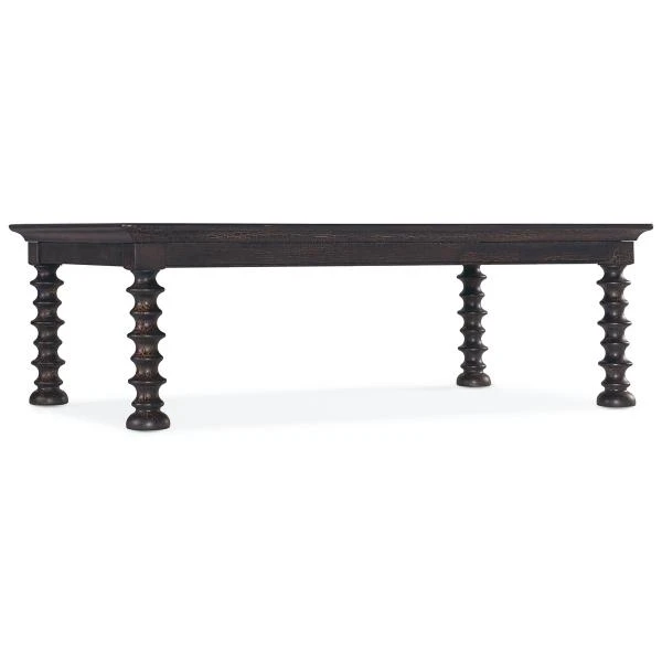 The vintage design of the Big Sky Turned Leg Cocktail Table evokes a simpler time and place in the natural beauty of the American countryside. Crafted of Pecky Hickory Veneers with a solid-wood edged top, its finished in Charred Timber, inspired by the restorative beauty of a fire-ravaged forest. The natural beauty and near mystical experience of the American wilderness inspires a spirited collection from Hooker Furniture, a celebration of dramatic vistas and the freedom to roam, a land of rough-hewn timber and towering snow-capped peaks, boundless plains, and cool, clear mountain lakes.