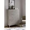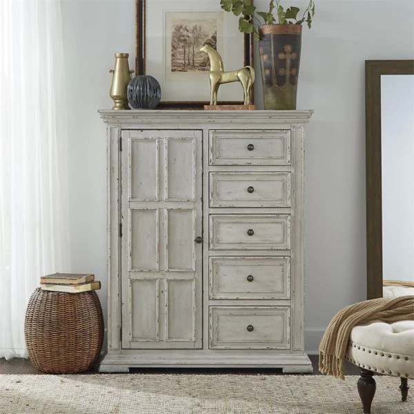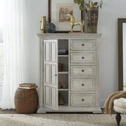 The Big Valley Door Chest features five drawers and one door with three adjustable shelves for lots of storage. It is crafted of Asian hardwood solids and birch veneers with a heavy distressing Whitestone finish. The drawers are constructed using French and English dovetail joinery and full extension metal side guides. The top drawer is felt lined and the bottom drawer is cedar lined. The knob hardware is finished in Antique Pewter.