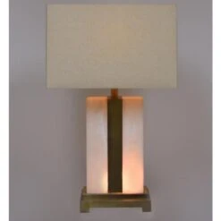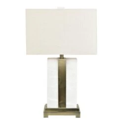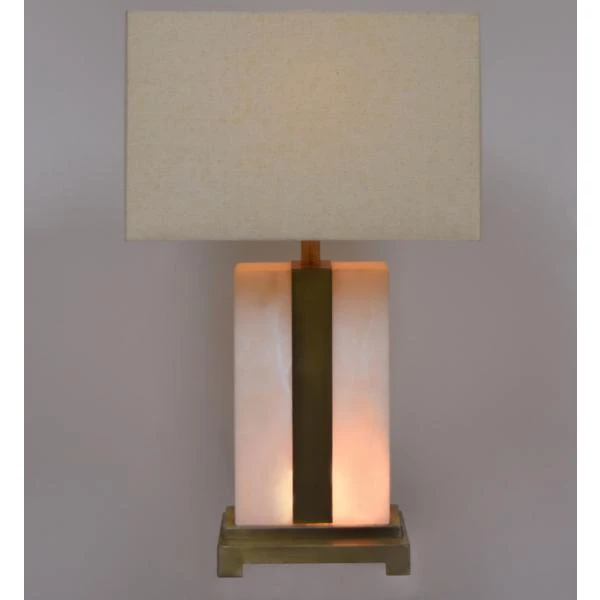 The Brooklyn Table Lamp displays an elegant alabaster finish body with brass finish detailing and features a soft oatmeal linen shade. The table lamp also features 3 different lighting options: top light only, base light only, or top and base lighting simultaneously.