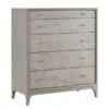 The Canyon Lake Chest is crafted of hardwood solids with wirebrushed quarter light flakey oak veneers in a brown finish. The chest features five drawers with English dovetail joinery, side mount ball bearing guides and drawer pulls in a tumbled silver finish.