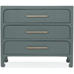 Cascade Cruiser Accent Chest by Hooker Furniture is constructed of hardwoods solids, MDF wood, and raffia in a Reef Blue lacquered grass cloth. Attractive Light champagne decorative bar pulls and chow-style legs add a designer touch. Three drawers with full extension soft close drawer glides and painted cream colored drawer interiors. This accent chest can work as a night stand, or as an accent anywhere in the home.