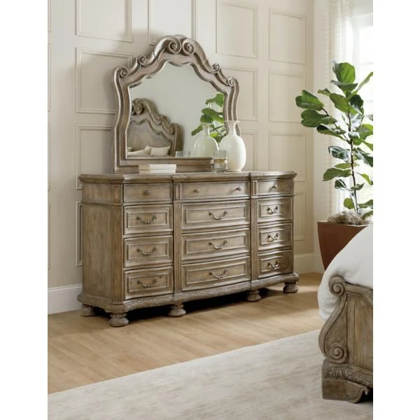 The Castella Dresser by Hooker Furniture is crafted of select hardwood solids with maple veneers and finished in antique slate. The twelve drawer dresser offers ample storage, removable felt liners, and cedar-lined bottoms. The center drawer has drop front to allow access to electronics. Decorative leaf base adds a Classic European design with an updated twist!