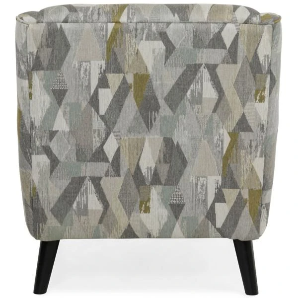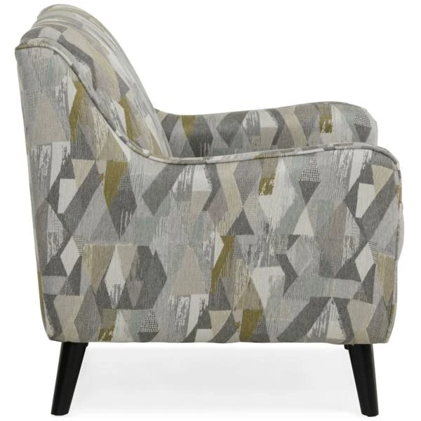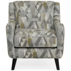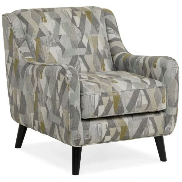 The Charlie Accent Chair has slim, sloped arms and supported by high legs for a light and airy feel. It is upholstered in a multi-colored pattern of grays, blue, and citron.