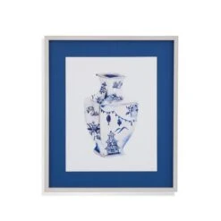 Chinoiserie III features a multi-tone blue and white painting of a ginger jar made of China. This art piece under glass is created using fine art cotton rag paper, a 3/4″ silver with white stain molding frame and bright blue matting. Made in the USA, D-ring or sawtooth picture hanging hardware included. The companion pieces that can be paired with this include Chinoiserie I, II & IV.