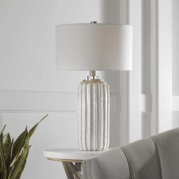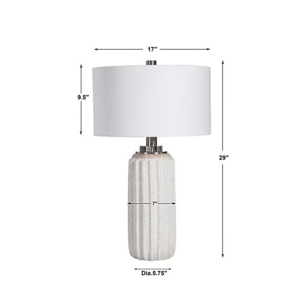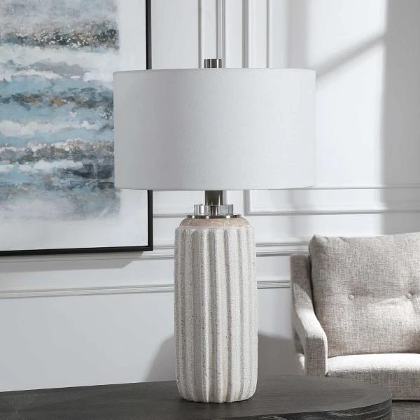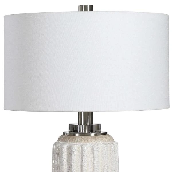 A nod to old-world style, the Dempsey Table Lamp features a distressed cream and beige crackle glaze with a deep ribbed texture, accented by brushed nickel and crystal details. A white linen fabric drum shade completes the look.