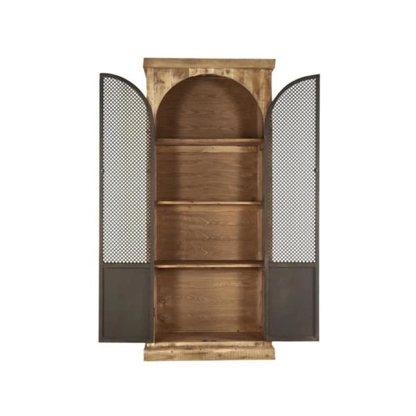 The Denton Arched Cabinet is crafted in reclaimed pine in a natural wood finish. It features iron metal doors and is a rustic accent piece, perfect for your home, individually, or in a pair of two or more.