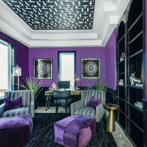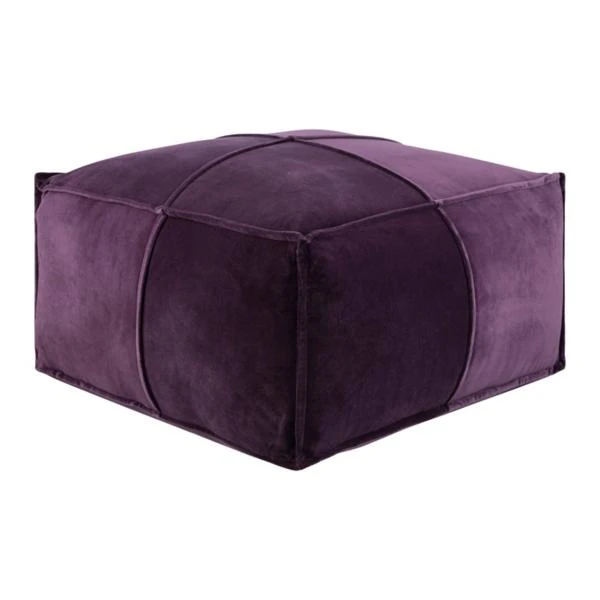 The Duval Pouf features a dark purple velvet, cotton cover with a flange edge and pleated design, filled with polyester/polyfill. This multi-purpose pouf can be used as an ottoman or as an accent piece.