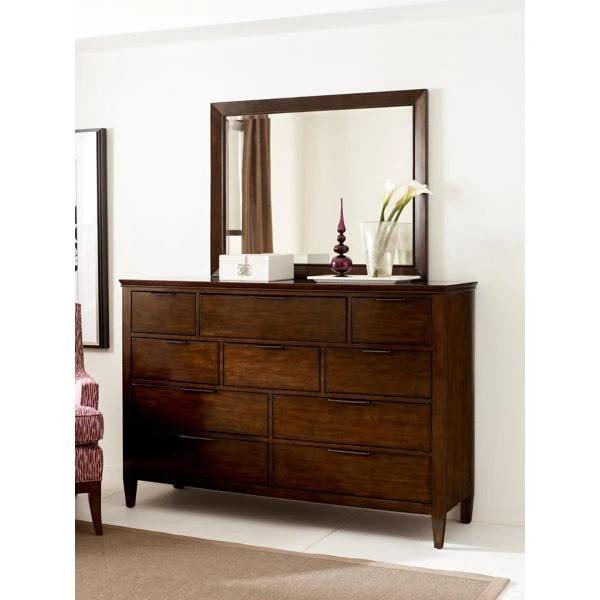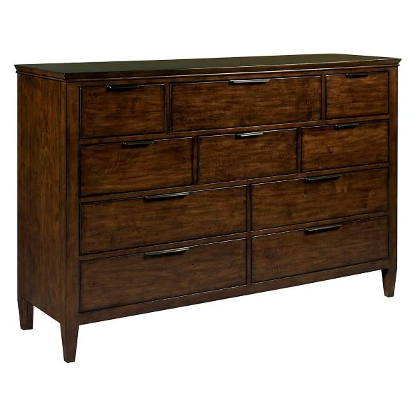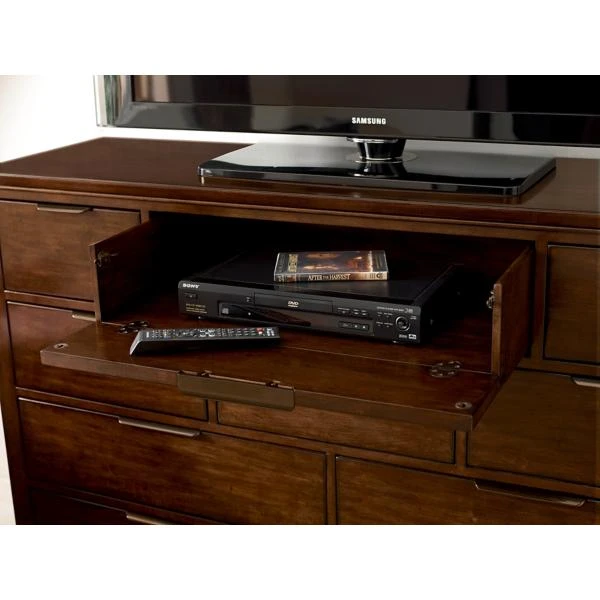 Elise Luccia Dresser by Kincaid has ten drawers and features a hand-rubbed amaretto finish. Crafted of solid maple wood and select hardwoods. The drawers feature brass finish pulls, English dovetail front and back with soft closing drawer glides. Top center drawer also features a flip down front making it ideal for use with a media component.