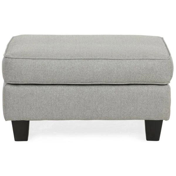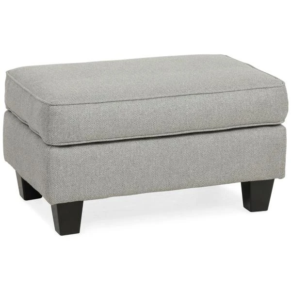 The Elliott Ottoman is upholstered in a gray textured fabric.