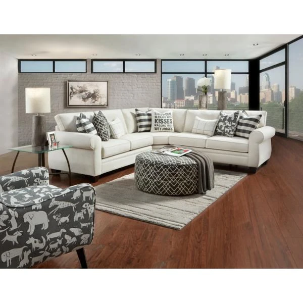 The Felix 3-Piece Sectional is upholstered in a soft-to-the-touch neutral fabric that serves as a great backdrop for some amazing patterned toss pillows, adding tones of black and grey. We love the way the plaid and check patterns work together. The dog patterned pillow and statement pillow add a bit of whimsy! 8 toss pillows included.