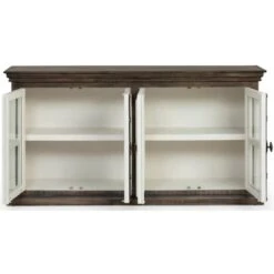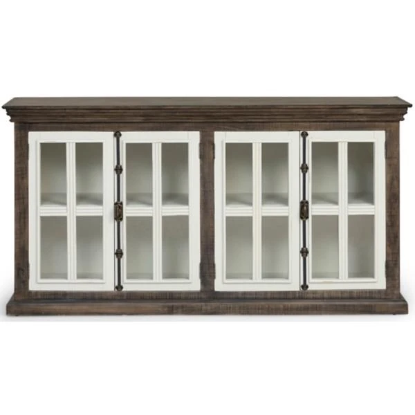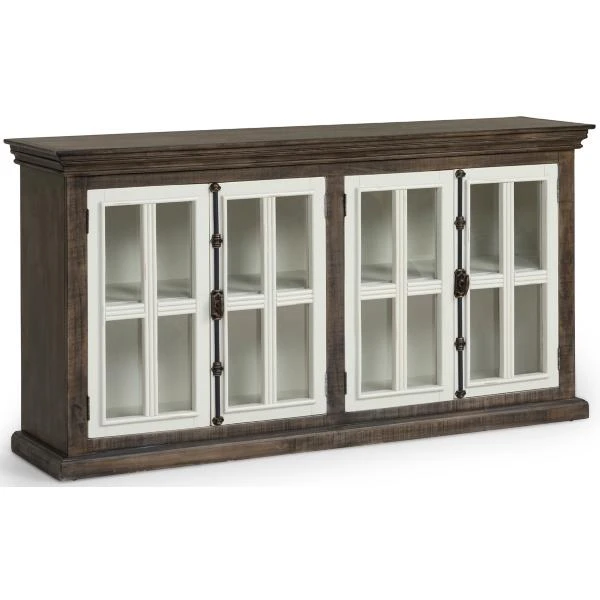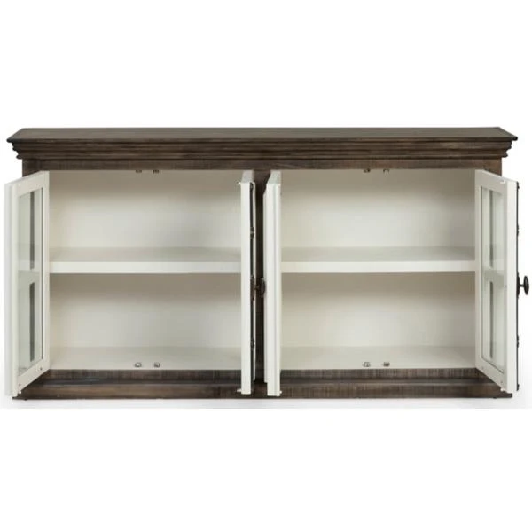 Crafted using pine solids and veneers, the Florence 70-Inch Media Console features a two-tone design in a summer gray finish with ivory trim around four wood-framed glass doors that open up to one interior shelf. With a multi-step lacquer finish and slight rub off on the edges, the cabinet also features generous molding trim on the top and base along with unique cremone bolt pulls in an oil rubbed bronze finish.