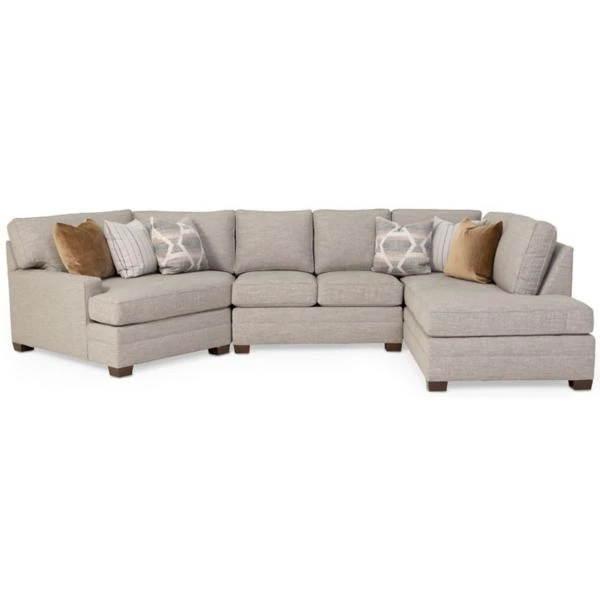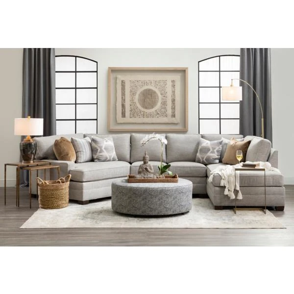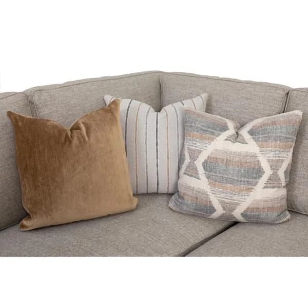 The Harper Sectional is family and friends approved. Great for maximizing seating and entertaining spaces, Harper offers a cuddler chaise on one side and a corner chaise on the other. It is upholstered in a heathered gray tone that is complemented with toss pillows in patterns of warm saddle and blue-grays.