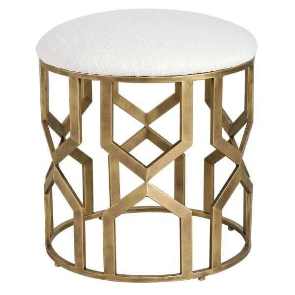 Stylish and versatile, this Jahdiel round accent stool showcases a solid iron base with a modern geometric motif finished in antique brushed brass. The cushioned top is upholstered in a crisp white textured fabric, doubling its use as a seat or footrest.