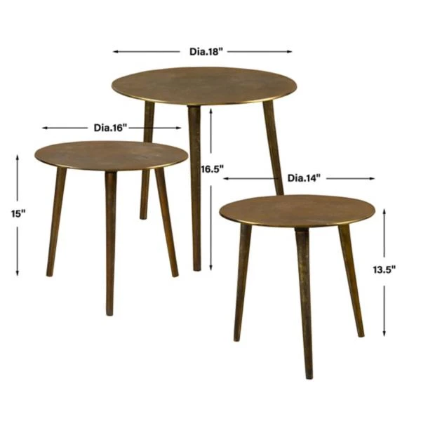 Kasai Coffee Table set of three nesting coffee tables are made from cast aluminum with noticeable texture and are finished in oxidized antique gold. Varying heights offer unique display opportunities.