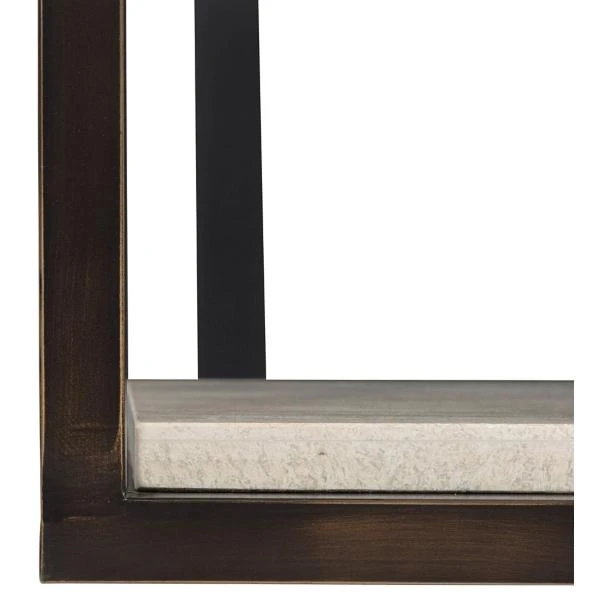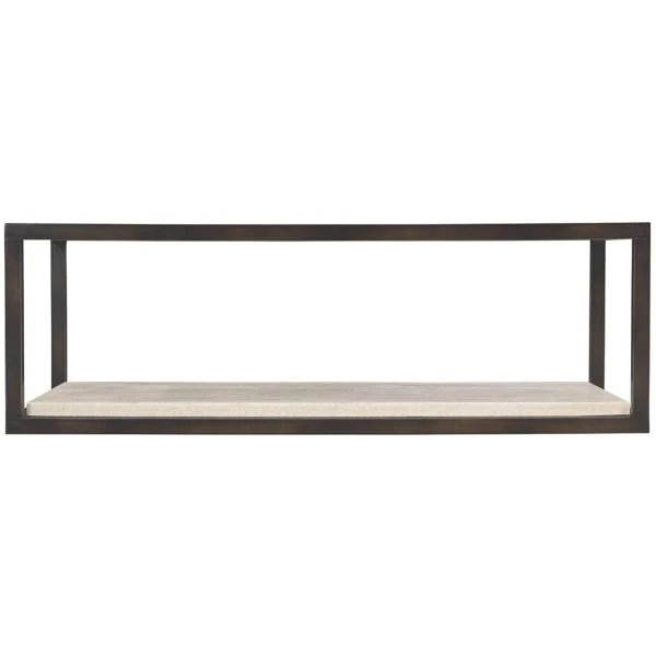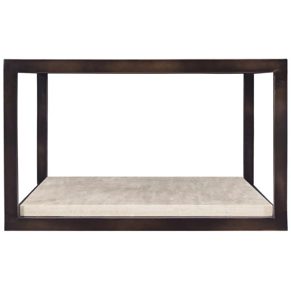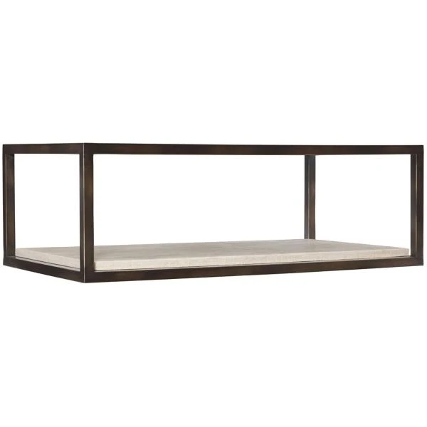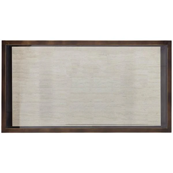 The Kinsley Coffee Table from Bernhardt is made of a tubular steel, bronze finish frame with laminated White Travertine bottom shelf and glass top with a 1 inch beveled edge. It features hidden casters so the table can move easily without much effort.