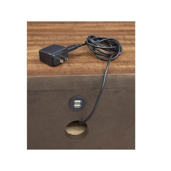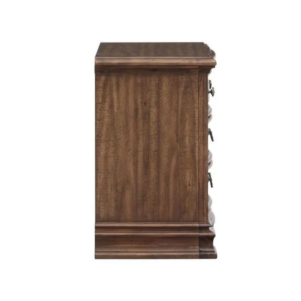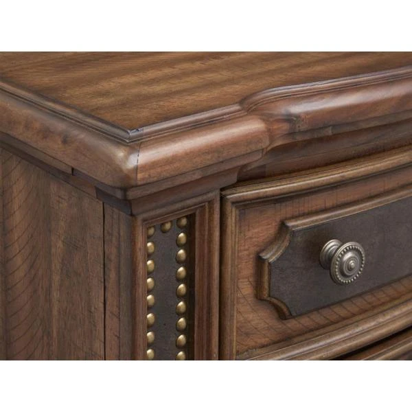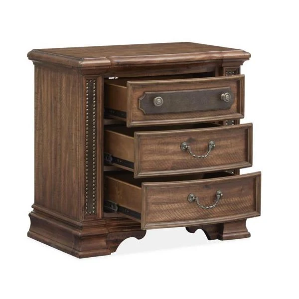 The Lamesa Nightstand is crafted of acacia solids with acacia veneers in a roasted pecan finish. The nightstand has contrasting polyurethane wrapping in a saddle brown finish on the drawer front and side pilaster. Accents include nail-head trim and hardware in antique brass finish. The nightstand features three drawers with French dovetail fronts and English dovetail backs with side mount metal drawer glides, felt lined top drawer, USB port and wire management.