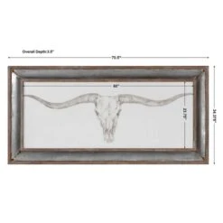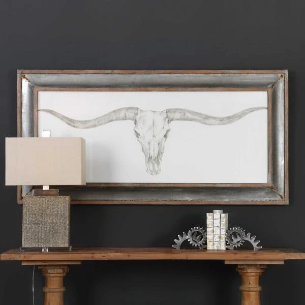 Rustic, western style radiates from this framed, monochromatic artwork. This simple, masculine design is surrounded by a galvanized tin frame with rust accents and a distressed barn wood outer frame and inner lip. This transitional print is placed under protective glass.