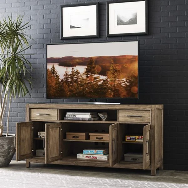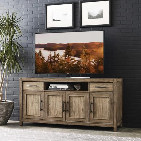 The Madero Calle Entertainment Console by Kincaid has a classic look and is made of white non-aromatic cedar with a Camel finish and hardware pulls with a black lacquered satin nickel finish. The Madero Calle entertainment console includes four doors that open to a single adjustable shelf behind each door, ventilation slots, two English dovetail drawers, a soft-closing drawer system, three plug electrical outlets, and wire management. Can accommodate up to a 65 inch TV.
