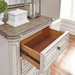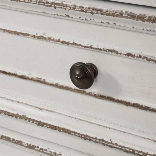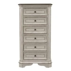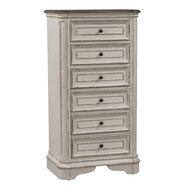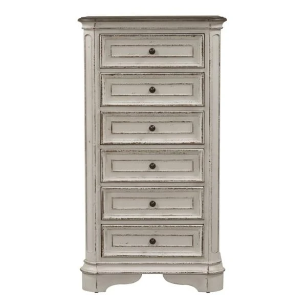 The Magnolia Manor Lingerie Chest is crafted of poplar solids with white oak and birch veneers in a rustic antique white finish with distressed brown top. The chest features six drawers with full extension drawer glides, fully stained drawer interiors, felt lined top drawer, cedar lined bottom drawer, bottom case dust proofing and antique brass knob hardware.