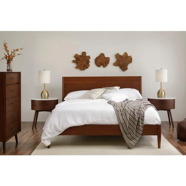 The Mid Century Eliot Oval Nightstand with Stone Top is crafted from Mahogany solids and veneers, decorated with Aged Bronze Drawer pulls, an accent faux stone top and is finished in an Acorn color. The nightstand includes English Dovetail drawer construction, double extension glides, and fully dust proof drawer bottoms.