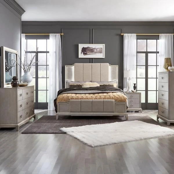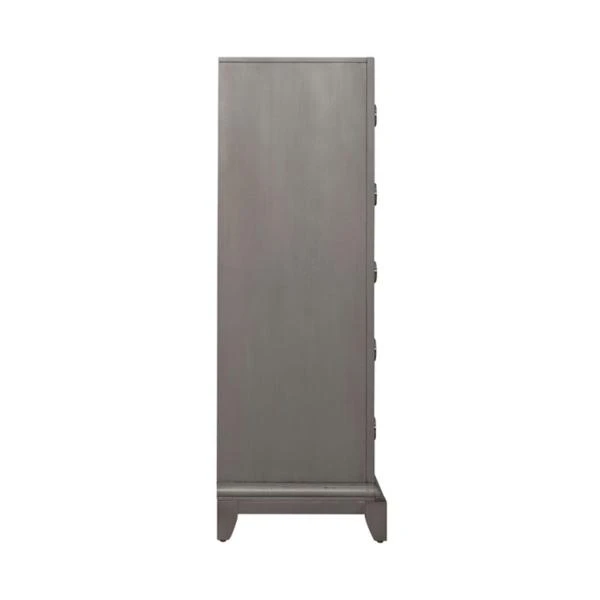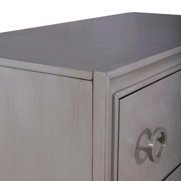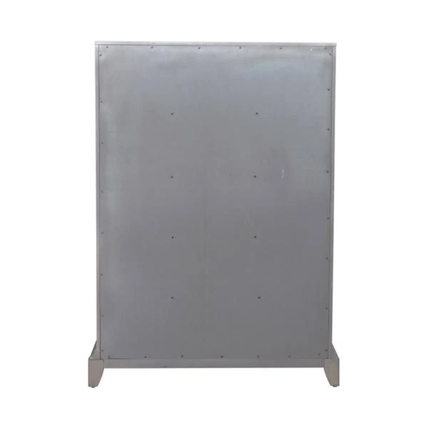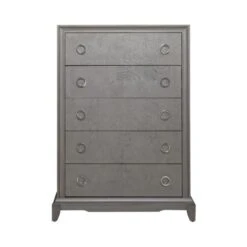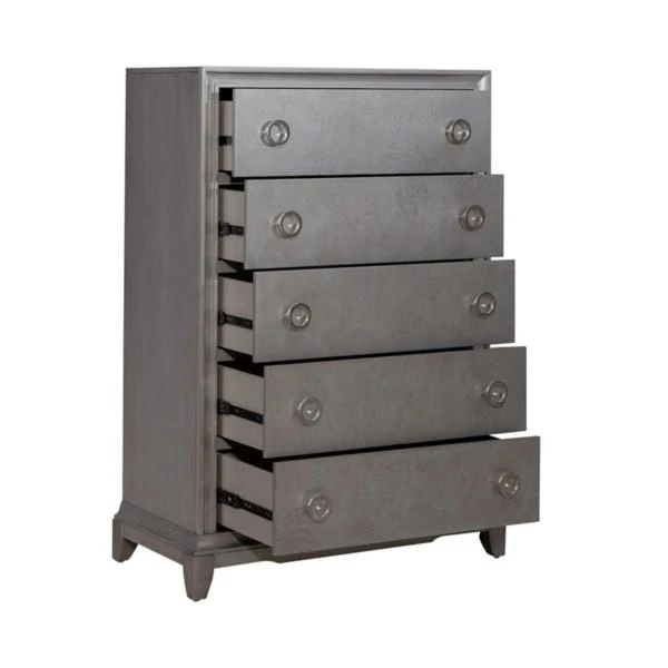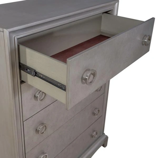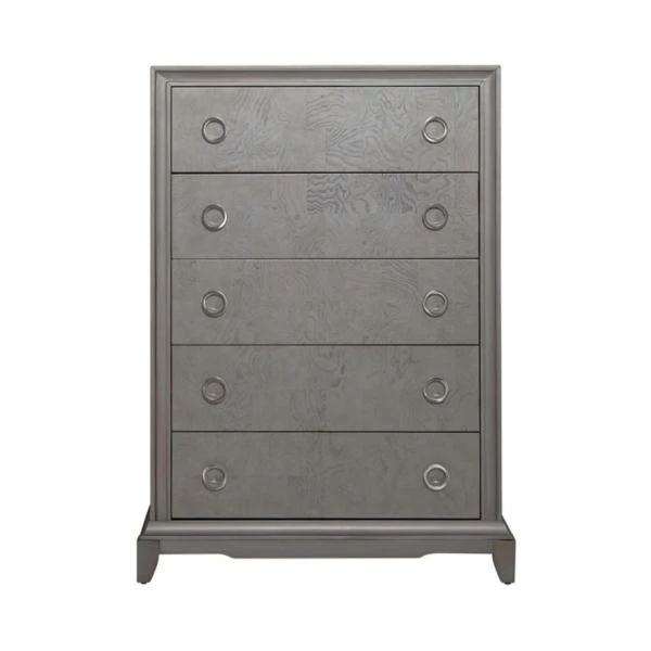 The Montage Five Drawer Chest is crafted of poplar solids with birch and ash burl veneers in a platinum finish. The chest features picture frame molding and brushed satin nickel finish hardware. The chest offers spacious storage with five drawers with French dovetail front, English dovetail back drawer contruction, full extension metal side drawer glides, fully stained drawer interiors, felt lined top drawer and cedar lined bottom drawer.