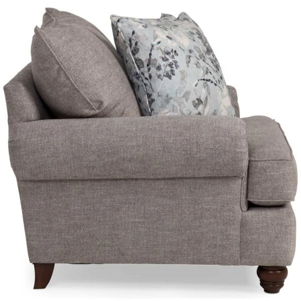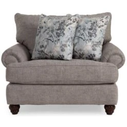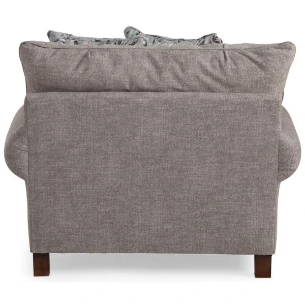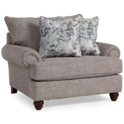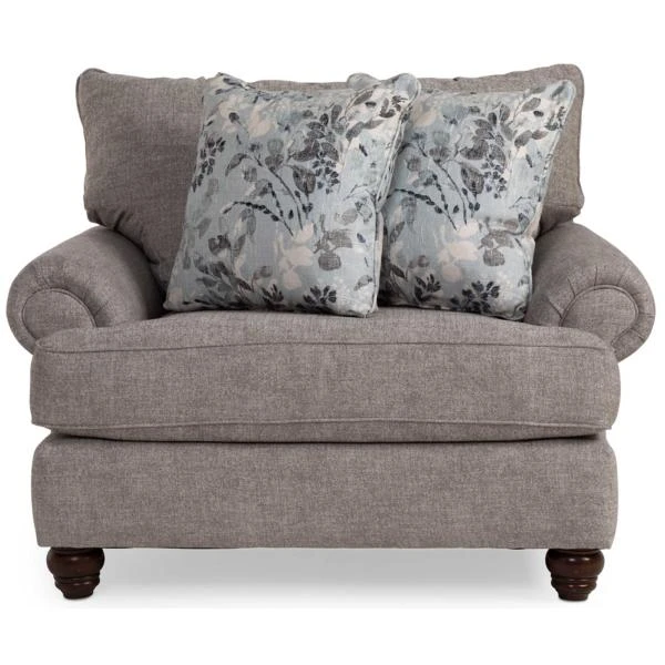 The Morgan chair and a half features extra deep seating with a loose bed pillow back cushion for a more casual look. A textured fabric for the body is a great backdrop for a pattern that features soft hues of blue and charcoal grey for two toss pillows.