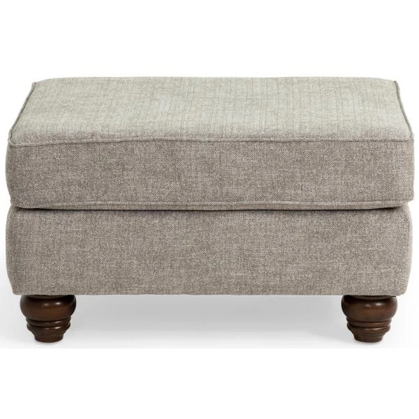 The Morgan Ottoman is upholstered in a neutral fabric and is supported by turned legs.