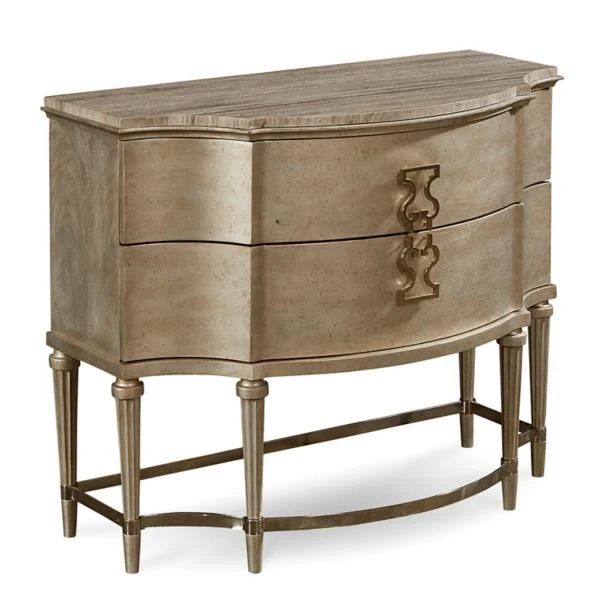 The Morrissey Bedside Chesthas a graceful serpentine front, six fluted legs and polished stone top are classically traditional, but the glamorous Bezel finish and bright custom hardware and metal stretchers are straight out of the days of Art Deco high style. In addition, the chest is constructed of Asian hardwood solids and primavera veneers.