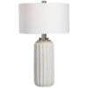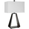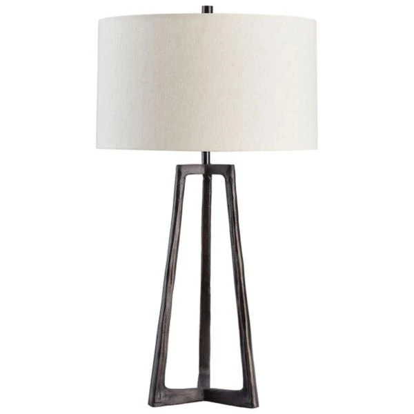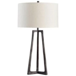 The Nolan table lamp has a structural metal base with an antique black tone finish. This lamp fits a variety styles like mid-century modern, contemporary, or industrial. It comes in two other finishes: antique brass and antique pewter. It uses an E26 150-watt lightbulb.