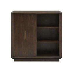 The Nouvel Door Chest is crafted of hardwood solids with cathedral and quartered walnut veneers and a rich russet finish. The door chest features five drawers with French dovetail fronts and English dovetail backs with side mount ball bearing guides, champagne gold finished handles, one sliding door, and two adjustable shelves.