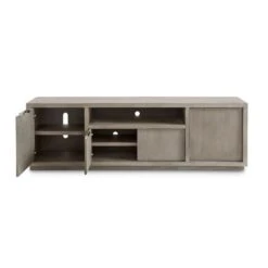 The Orion Collection, constructed from acacia solids and veneers, combines clean lines, wire-brushing, nickel finish hardware, and a light, mineral finish for an updated modern look. The Orion 84-Inch TV Stand features four doors, adjustable shelves, and wire management provisions.