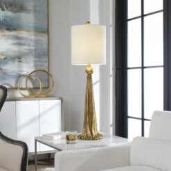 The Paloma Buffet Lamp is a drapery inspired design that is hand finished in a heavily antiqued metallic gold. The round hardback drum shade is a white linen fabric with light slubbing.