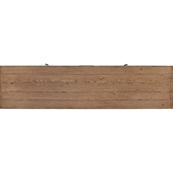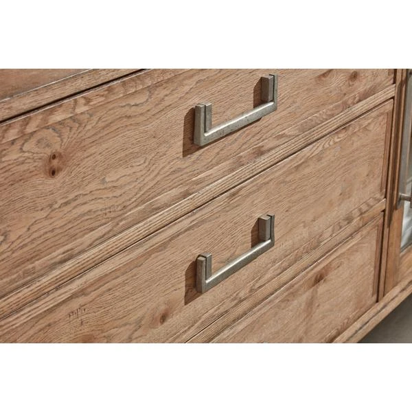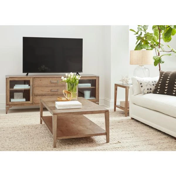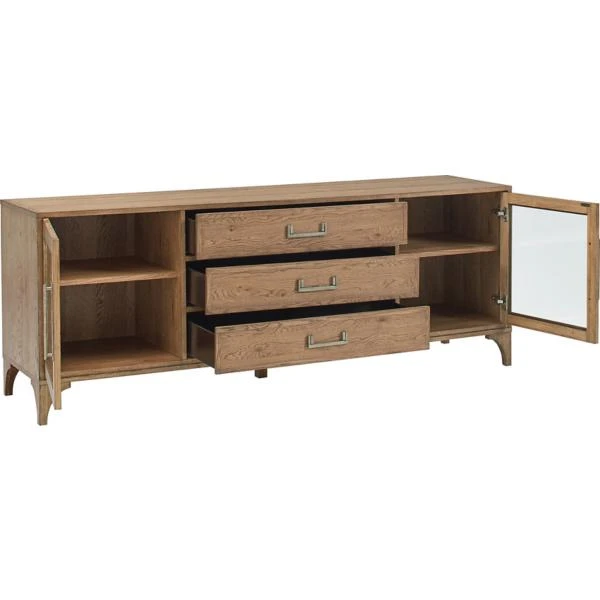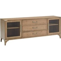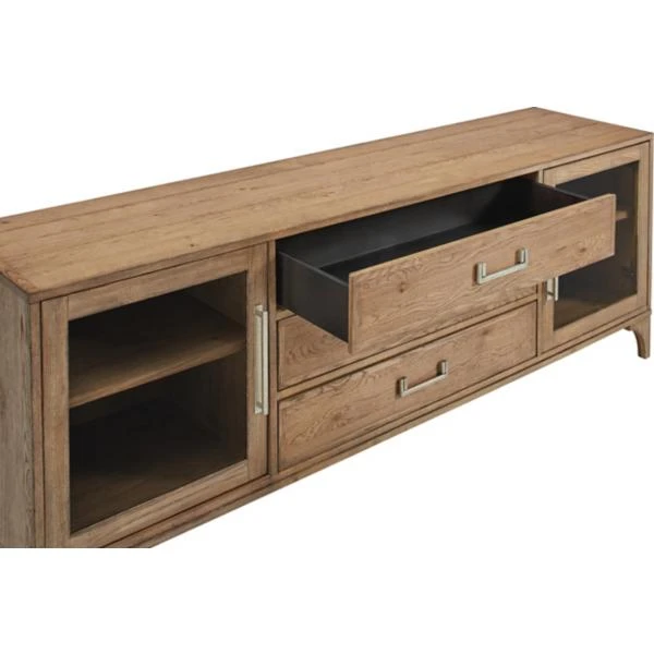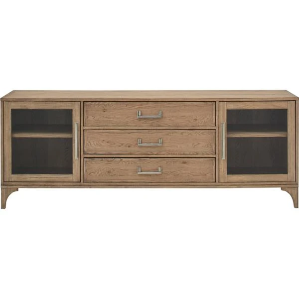The Passages Media Console features three drawers, two wood framed glass doors, two interior wood shelves and wire management. In addition, The Passages Media Console is constructed with Ash solids with knotty oak veneers and a natural finish. This rustic console also has distressed nickel hardware and corner accents.