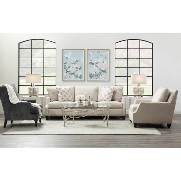 Transitional styling allows the Pearl Sofa to feel at home in both traditional and modern settings. Nail head trim frames the top and bottom rails and accents the shape of the arms. A neutral texture for the body fabric supports correlating neutral patterns for four toss pillows.