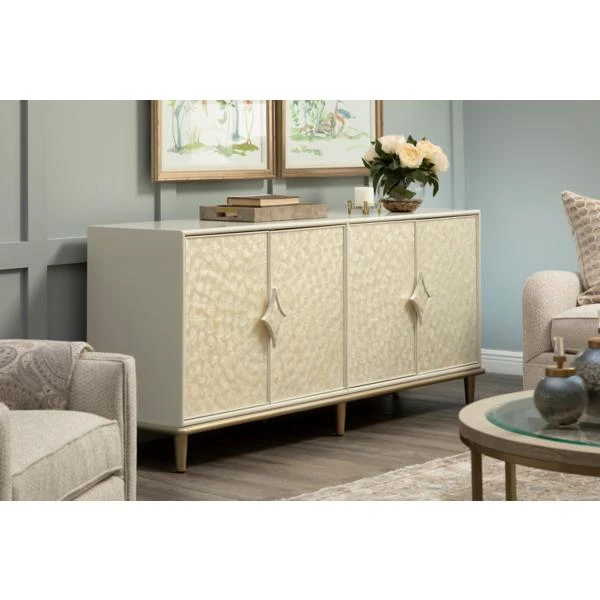 The Hooker Furniture Perla Entertainment Console features a creamy white finish with a little shimmer from the capiz shell inlay on the 4 framed doors. It has Silver tone metal base trim and feet. This console will provide a stunning statement piece in any room and will accommodate up to a 75″ Flat Screen TV.
