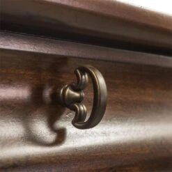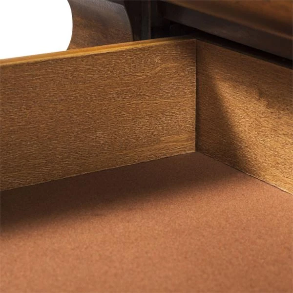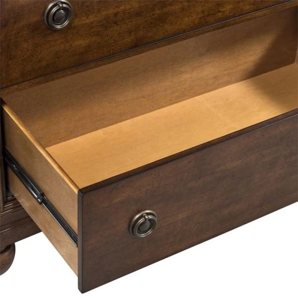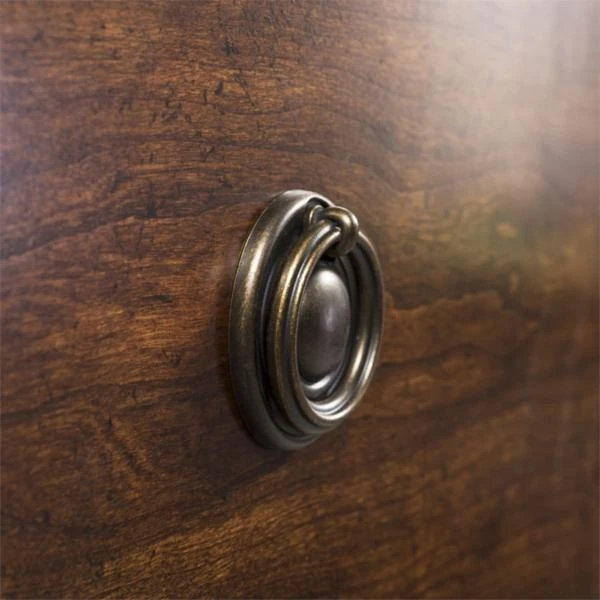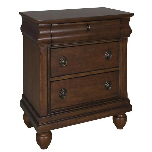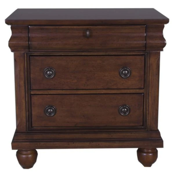 The Richmond Nightstand is designed with a burnished, rasped, rustic Cherry finish. Crafted of poplar solids with cathedral cherry veneers, it features 3 full extension drawers. Stunning antique brass drop ring and key hardware provide a sophisticated look.