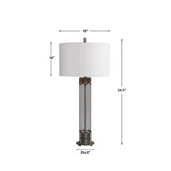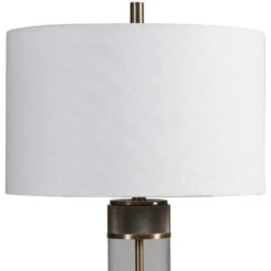 Showcasing a clean transitional look, the Riordan Table Lamp features a clear glass base accented with antiqued brass plated, and heavy textured iron details for a soft industrial feel. The lamp is paired with a white fabric drum shade. Crafted Using Glass & Iron, Uses E26 150 Watt Lightbulb.