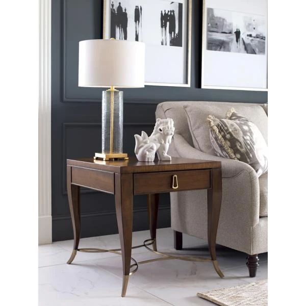 The Roanoke Collection is crafted using walnut veneers and solid wood with delicate accents of stainless steel in a bronze finish. The Roanoke End Table features tapered, curved legs and one drawer with soft close guides and ring pull hardware.