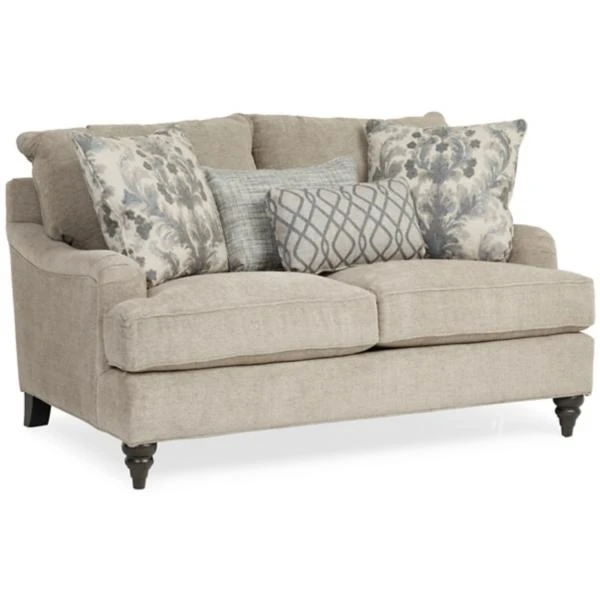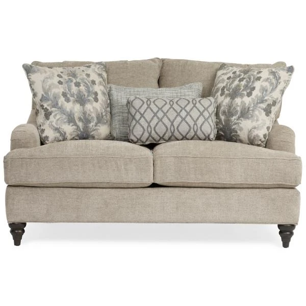 The Shelby Loveseat by Paula Dean has style elements that allow it to be dressed up or down. Upholstered in a soft, neutral texture that is surrounded by patterns for the pillows that introduce grays and blues. Custom orders available. Toss pillows included. See stores for details.