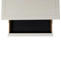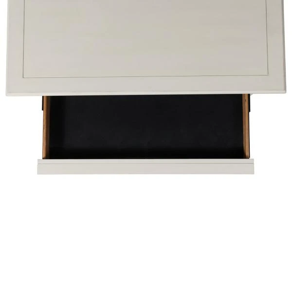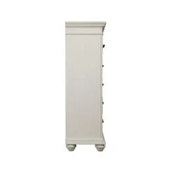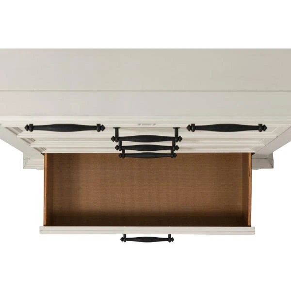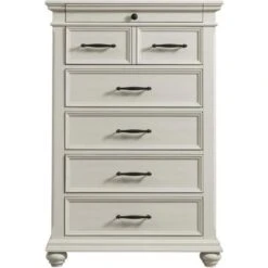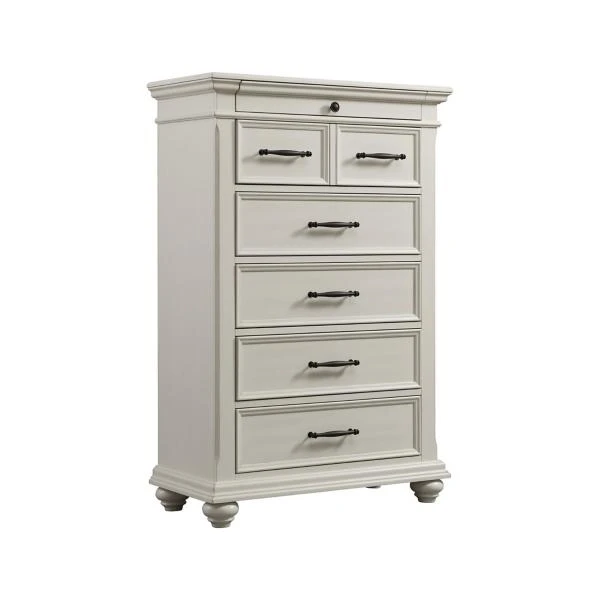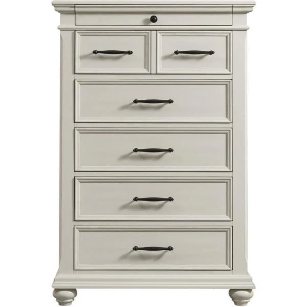The Slater Chest is crafted of Poplar solids with oak veneers and finished in an Antique White finish. The chest features six drawers, crown molding top, antique bronze finished pulls, and felt lined top