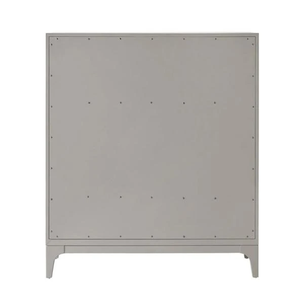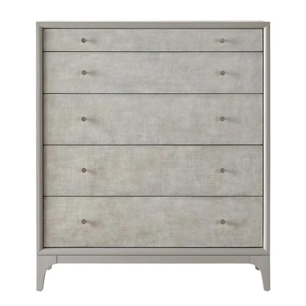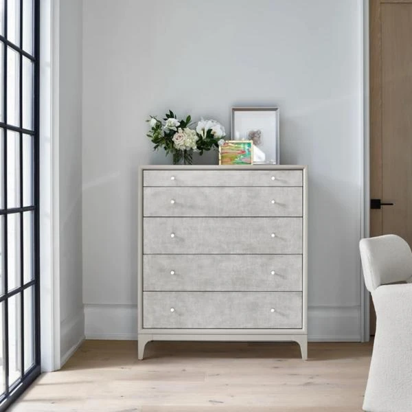 Tranquility Chest by Miranda Kerr is crafted of poplar solids and birch veneers. Moonstone finished frame with contrasting Aura Linen fabric texture fronts. The chest features five drawers, English dovetail joinery with full extension soft close drawer glides, soft gold finish pulls, removable jewelry trays, wooden dividers in each drawer and cedar lined bottom drawer.