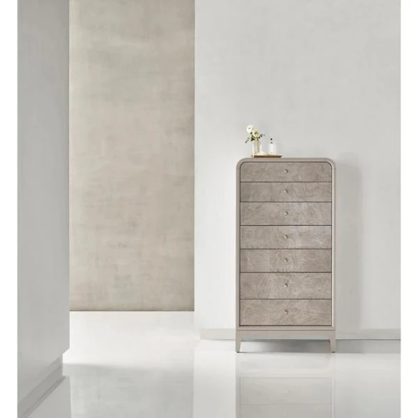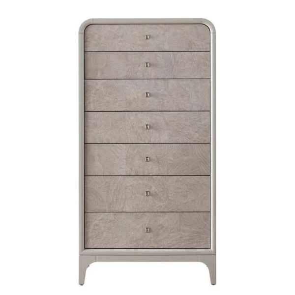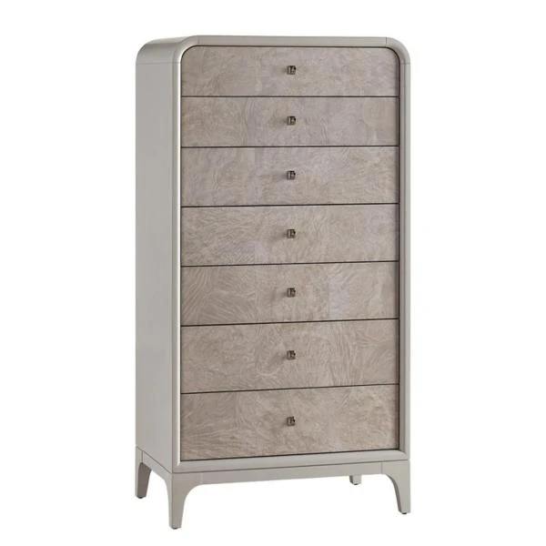 Tranquility Immersion Lingerie Chest by Miranda Kerr is crafted of poplar solids and birch veneers. Moonstone finished frame with contrasting Madrone Burl finish drawer fronts enhances this beautiful piece. The lingerie chest features seven drawers, English dovetail joinery with full extension soft close drawer glides, soft gold finish pulls, and cedar lined bottom drawer.
