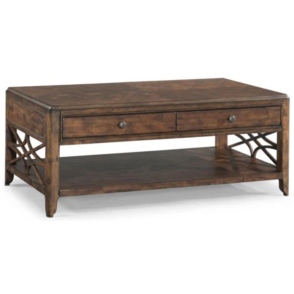 The Georgia Rain Cocktail Table from the Trisha Yearwood Home Collection has a brown finish with heavy distressing and burnishing that creates an uneven relaxed appearance to reflect years of wear and tear. This finishing technique blends a medium brown base with highlights underneath to invite a relaxed lifestyle. It includes two drawers, one display shelf and unique lattice-like open woodwork. <BR><BR>For more details contact the nearest Star Furniture showroom or request information below.
