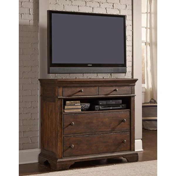 Trisha’s Stillwater Media Chest has her beautiful brown finish with heavy distressing and burnishing that creates an uneven relaxed appearance to reflect years of wear and tear. This finishing technique blends a medium brown base with highlights underneath to invite a relaxed lifestyle. It features 4 drawers, a cut-out shelf for media equipment and it also has a built-in extension cord for easy cord management.